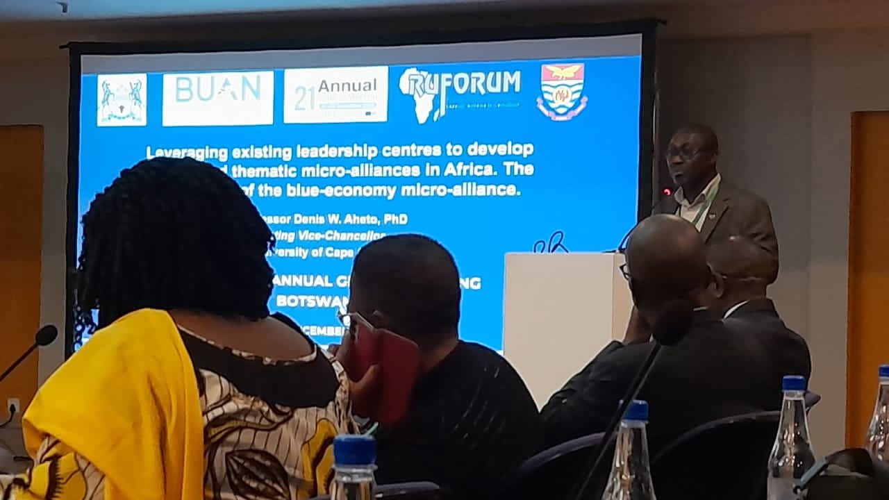 Prof. Aheto made this call at the Vice-Chancellor’s Forum at the 21st Regional Universities Forum for Capacity Building in Agriculture (RUFORUM) Annual General Meeting (AGM) in Gaborone, Botswana, where he delivered a lead paper titled “Leveraging Existing Leadership Centres to Develop Specialised Thematic Micro-Alliances in Africa: The Case of the Blue-Economy Micro-Alliance.”